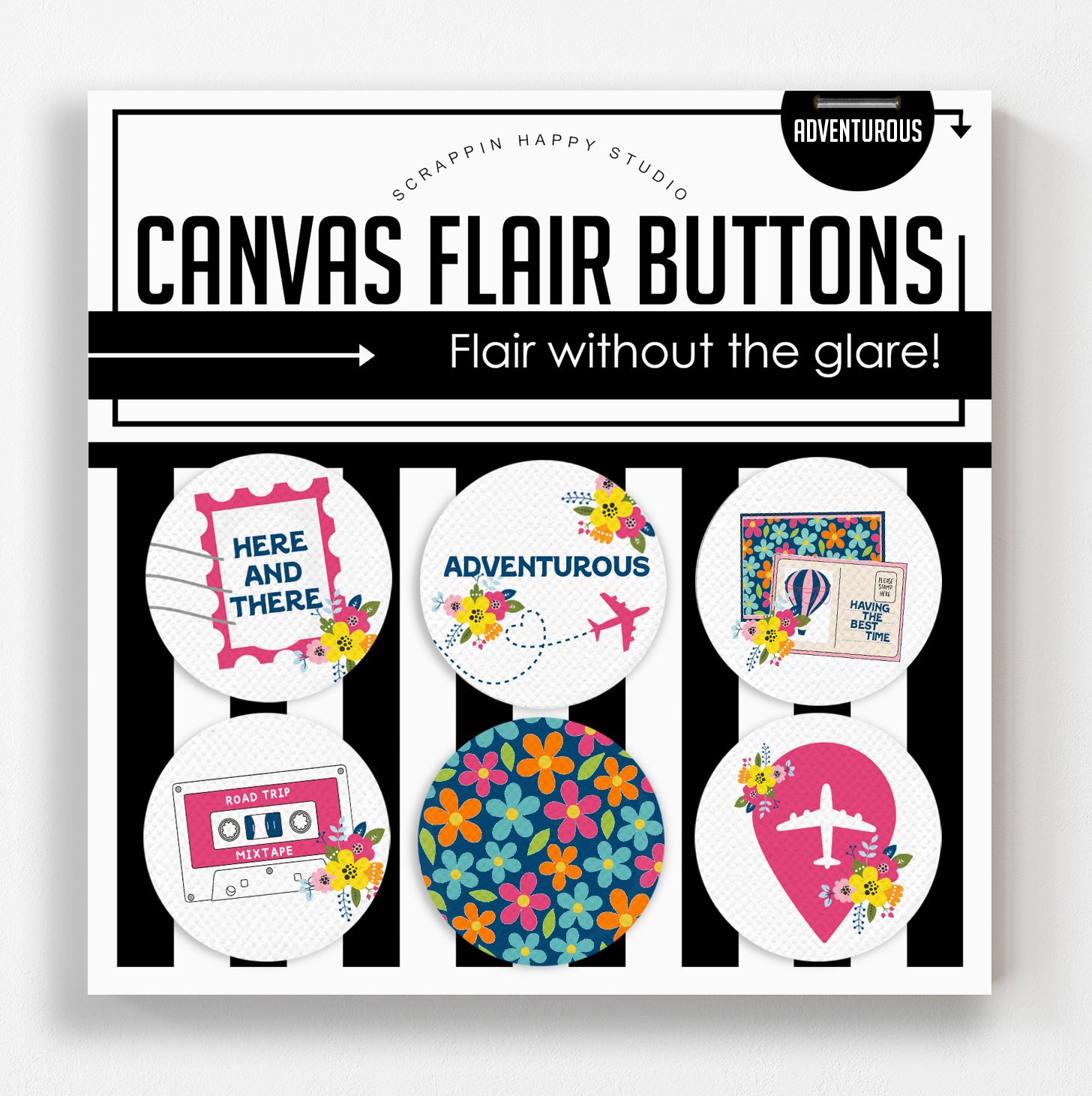 Set of (6) 1.25" canvas flair, comes attached to a backing card.