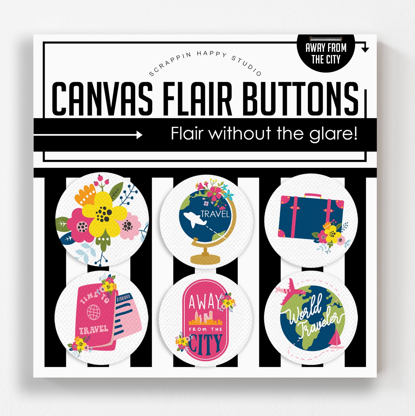 Set of (6) 1.25" canvas flair, comes attached to a backing card.