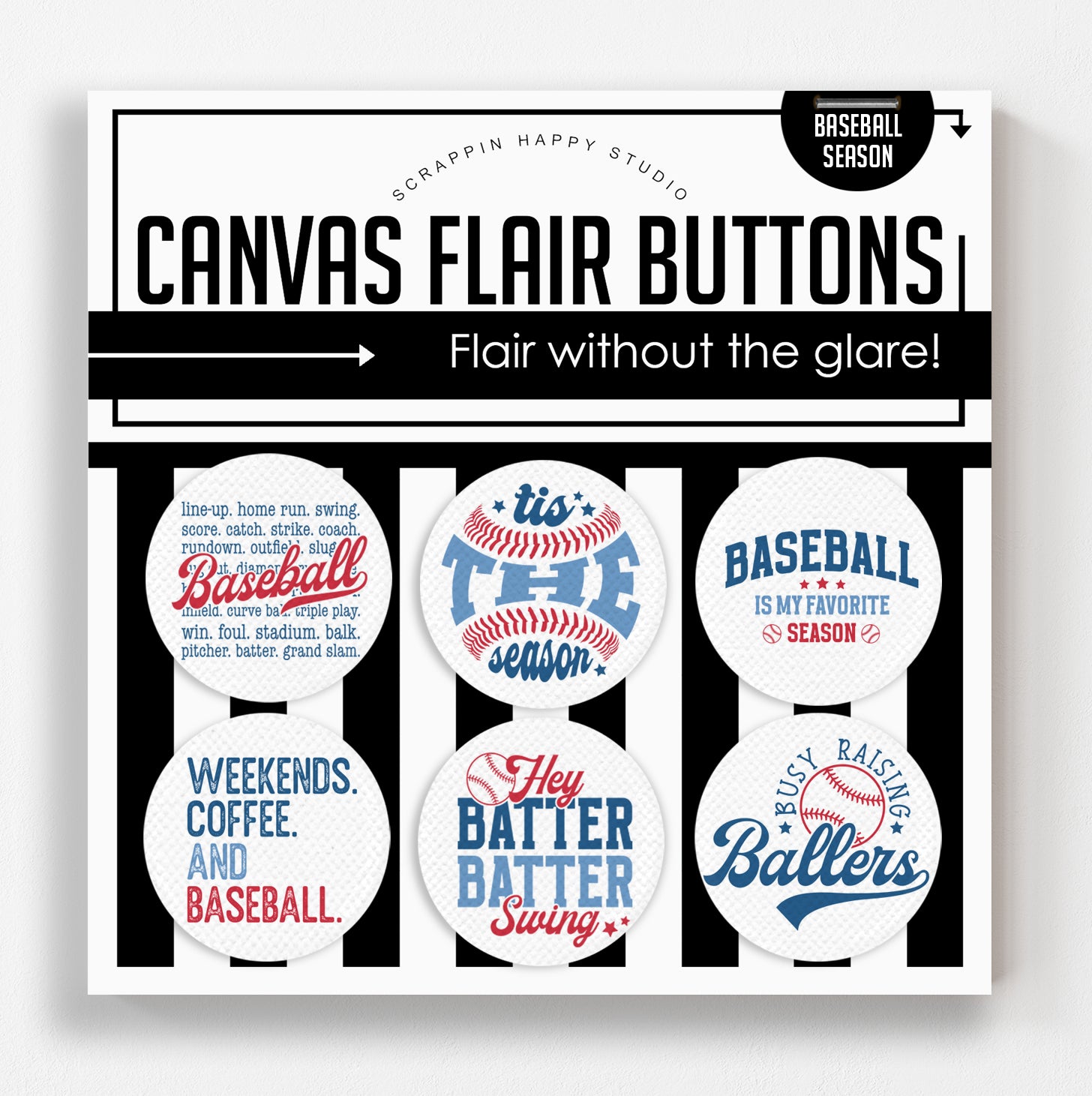 Set of (6) 1.25" canvas flair, comes attached to a backing card.