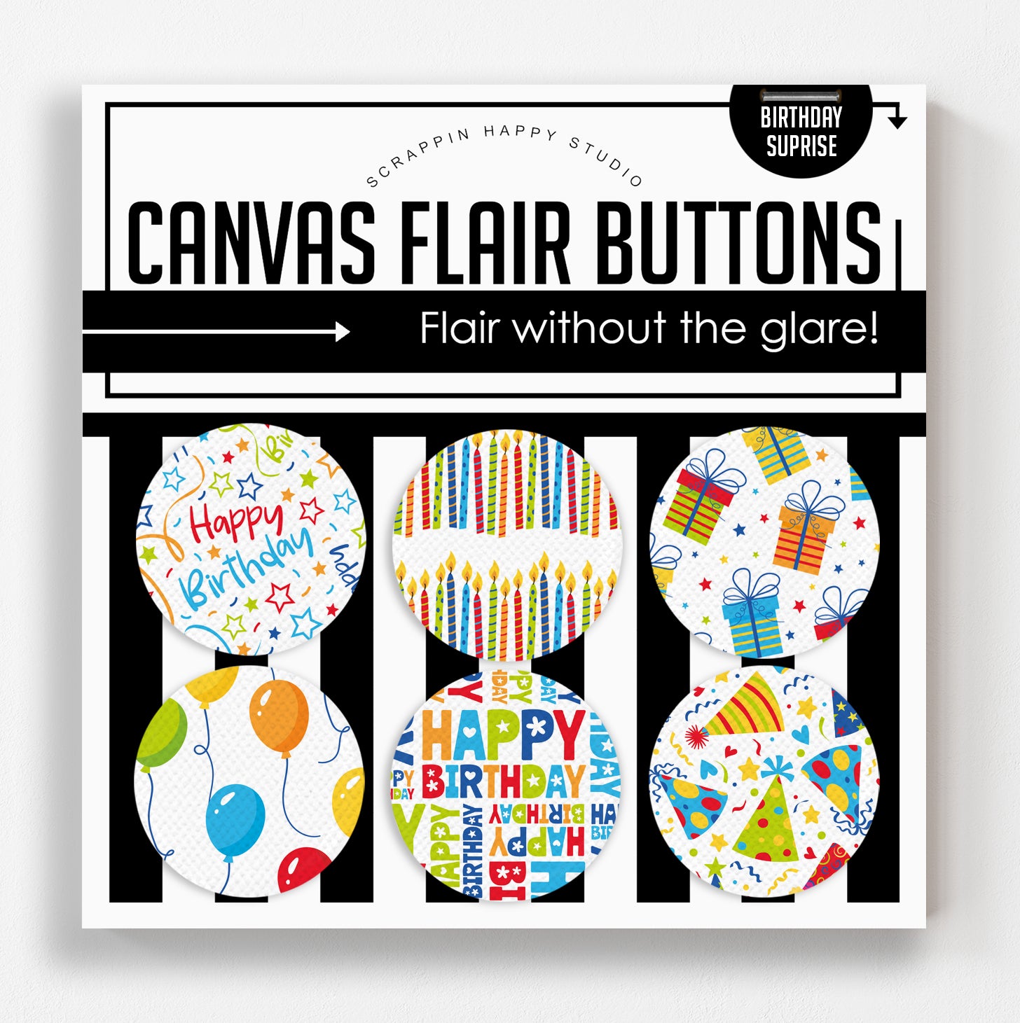Set of (6) 1.25" canvas flair, comes attached to a backing card.