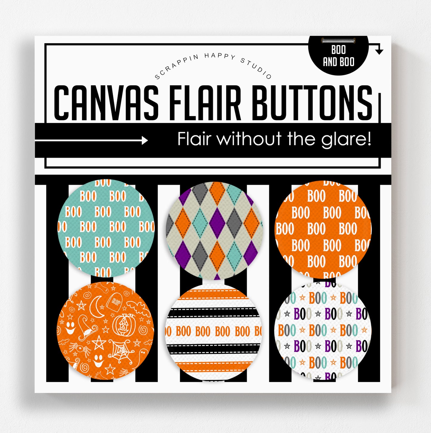 Set of (6) 1.25" canvas flair, comes attached to a backing card.