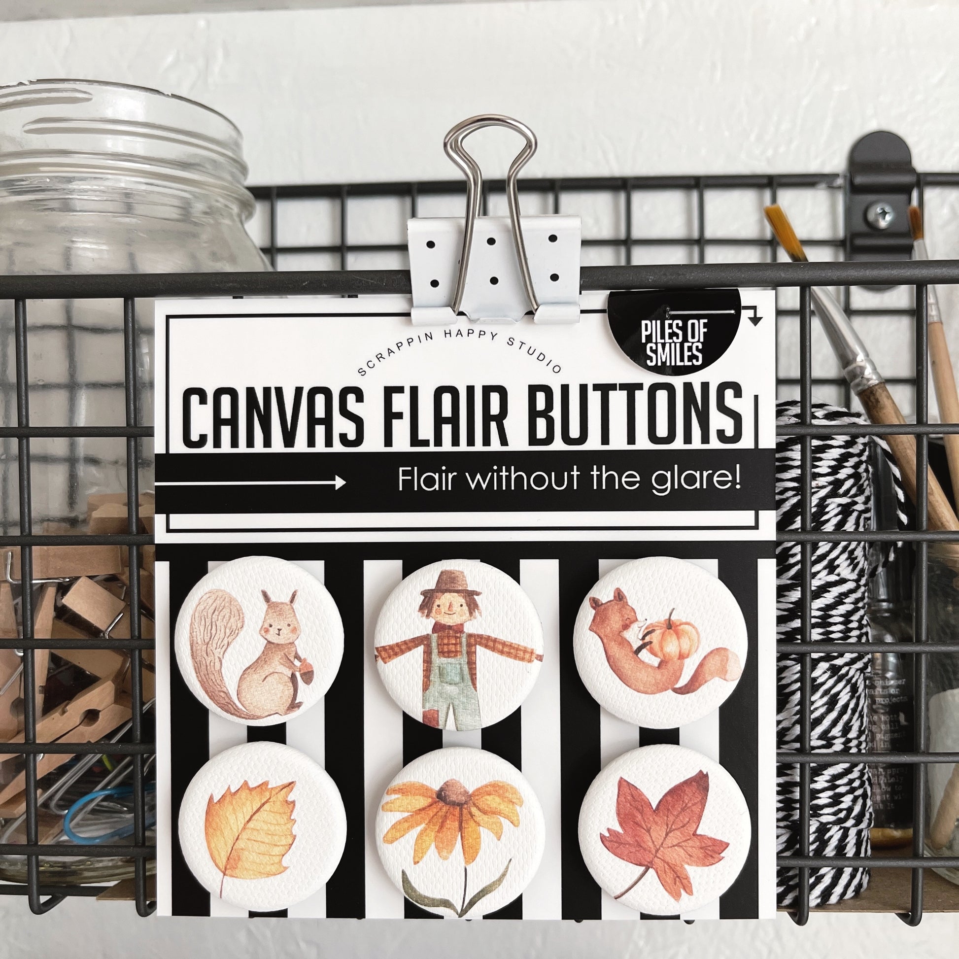 Set of (6) 1.25" canvas flair, comes attached to a backing card.