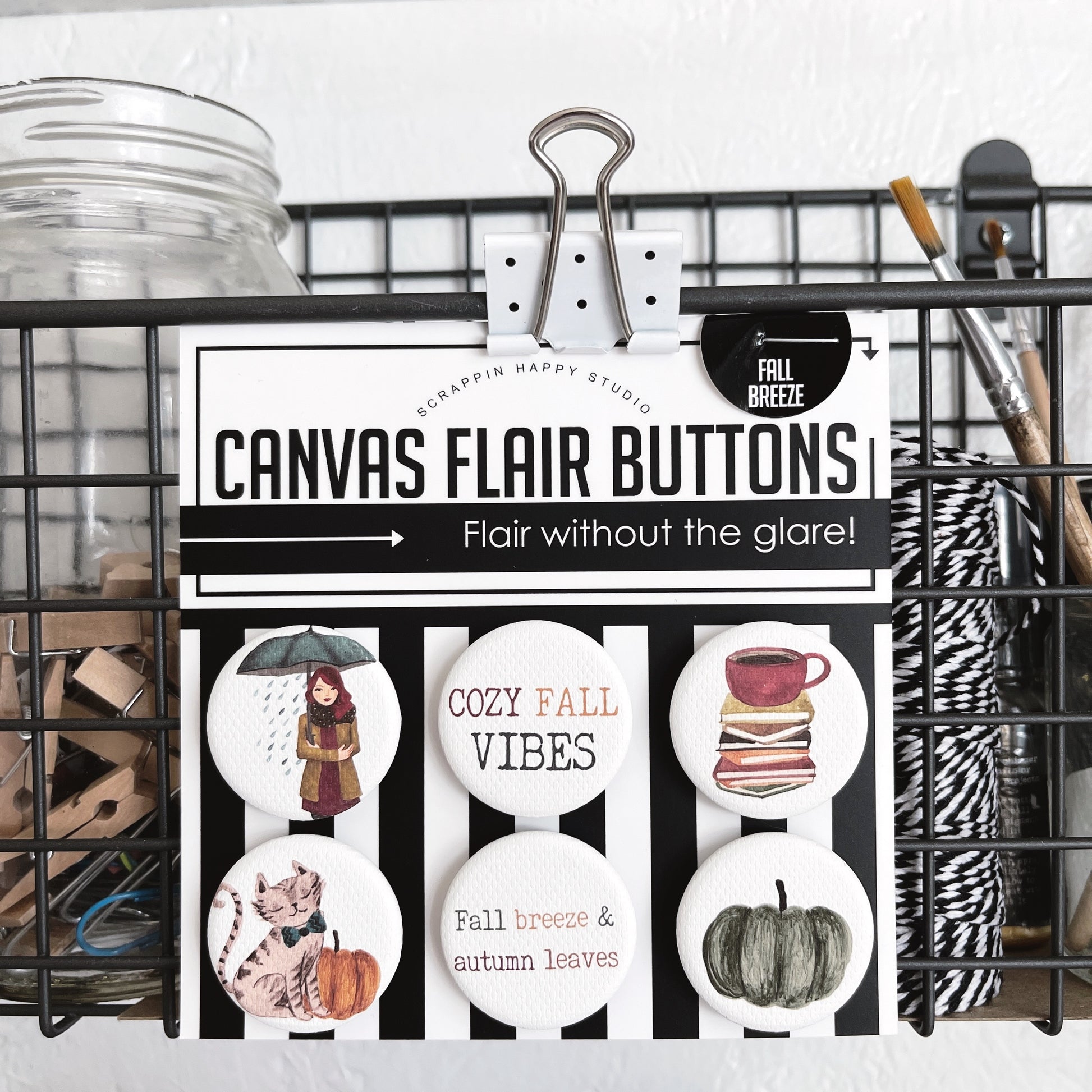 Set of (6) 1.25" canvas flair, comes attached to a backing card.