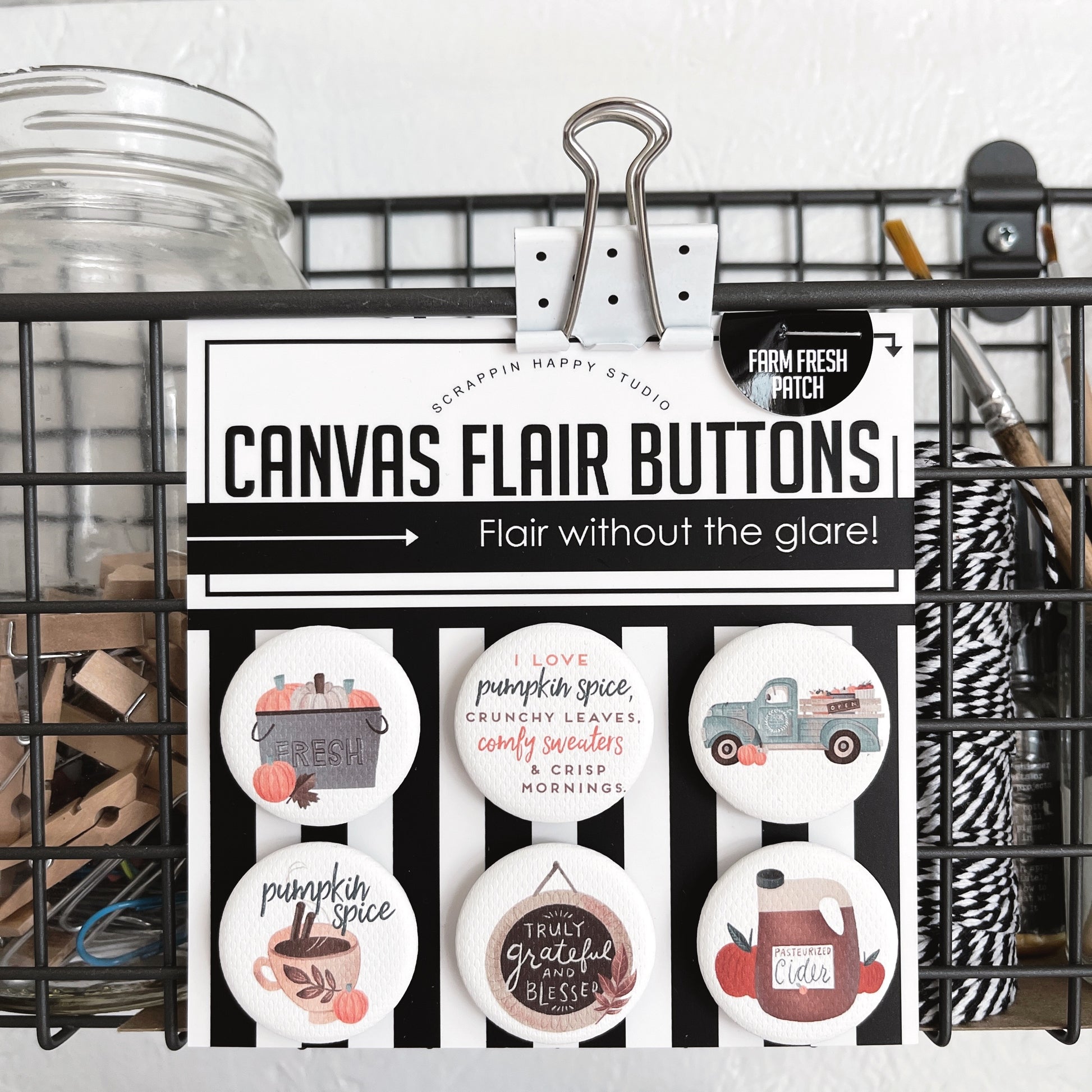 Set of (6) 1.25" canvas flair, comes attached to a backing card.