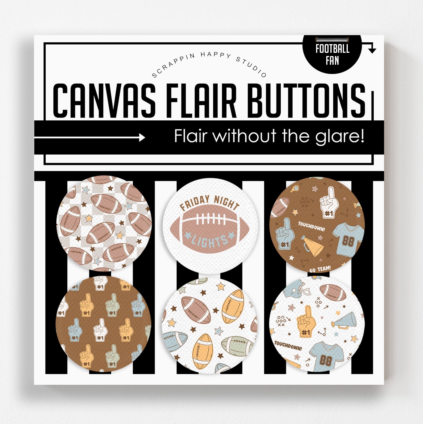 Set of (6) 1.25" canvas flair, comes attached to a backing card.