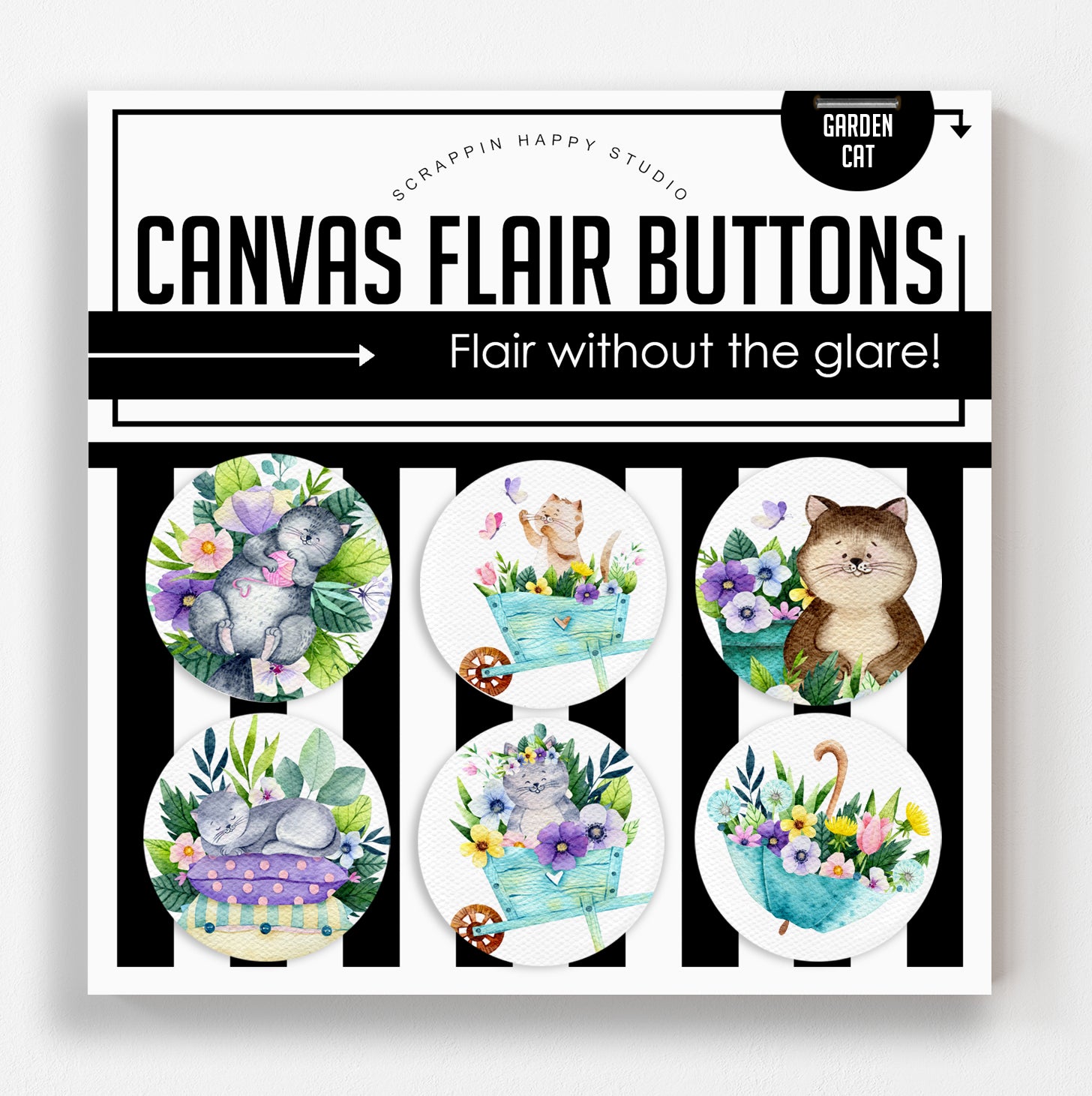 Set of (6) 1.25" canvas flair, comes attached to a backing card.