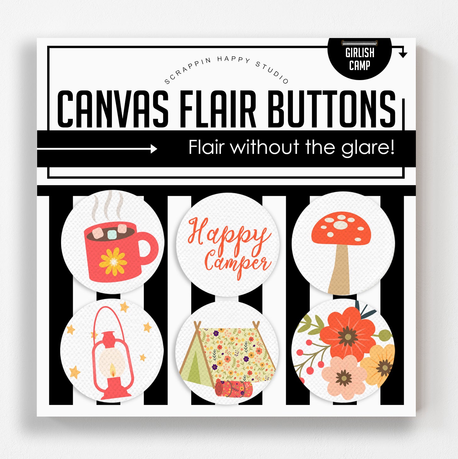 Set of (6) 1.25" canvas flair, comes attached to a backing card.