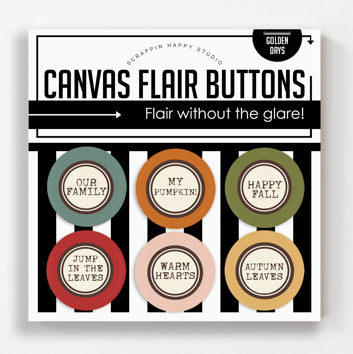 Set of (6) 1.25" canvas flair, comes attached to a backing card.