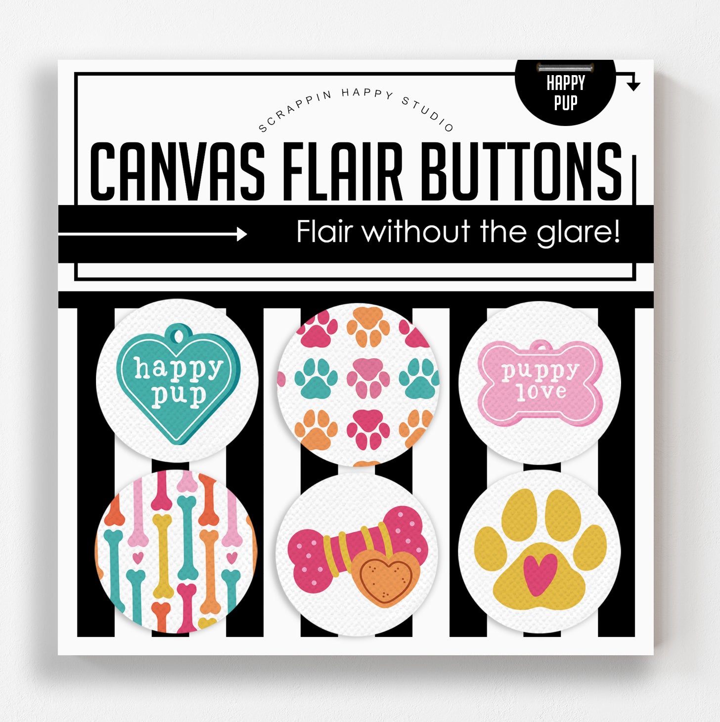 Set of (6) 1.25" canvas flair, comes attached to a backing card.