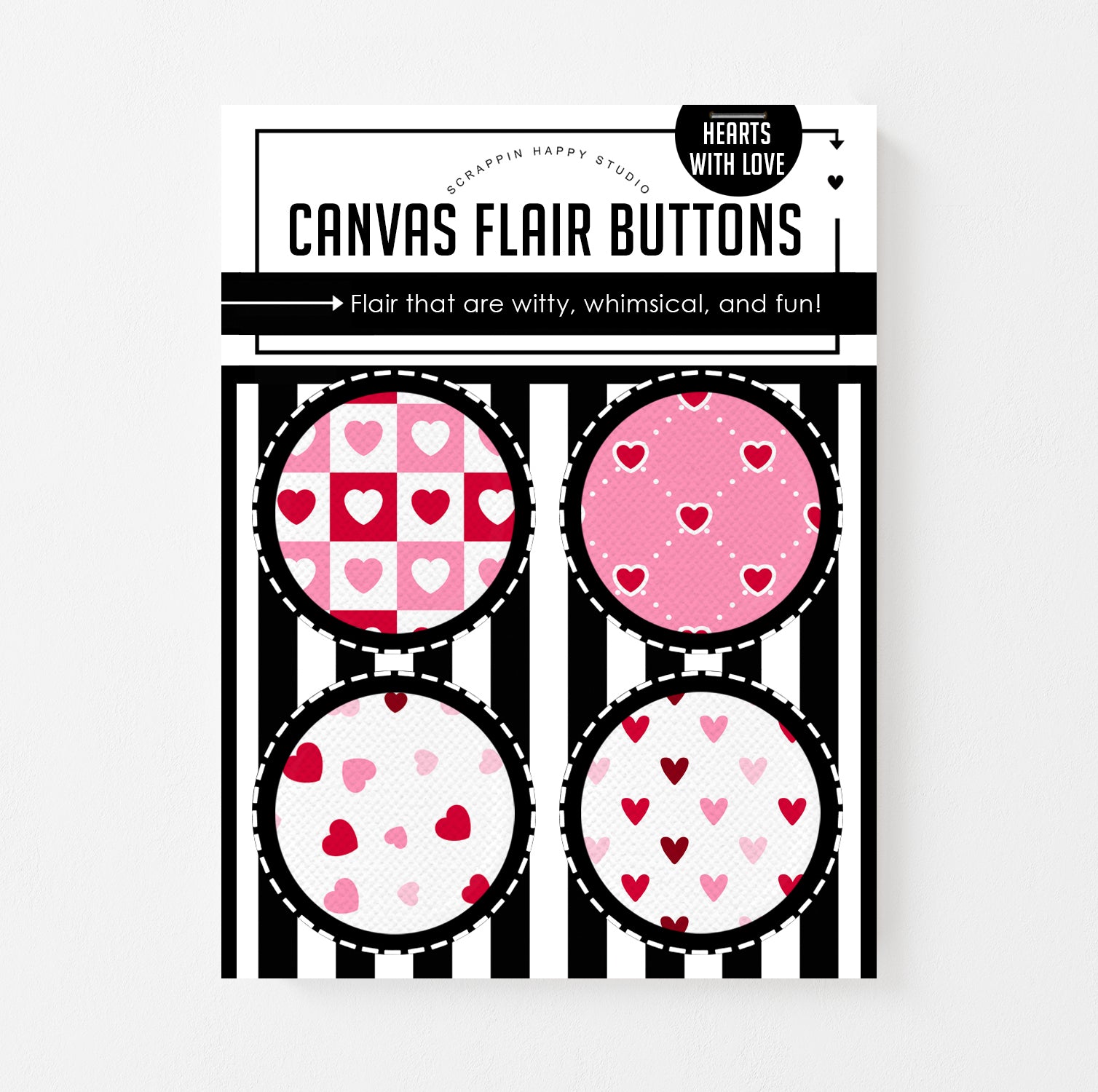 Set of (4) 1.25" canvas flair, comes attached to a backing card.