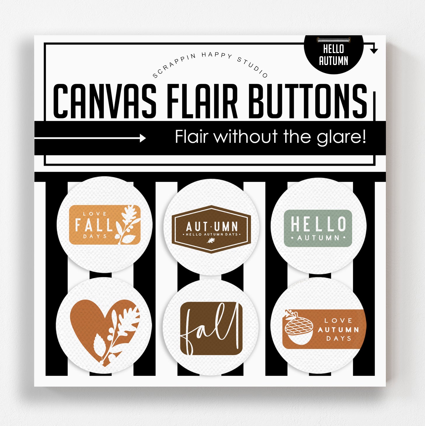 Set of (6) 1.25" canvas flair, comes attached to a backing card.