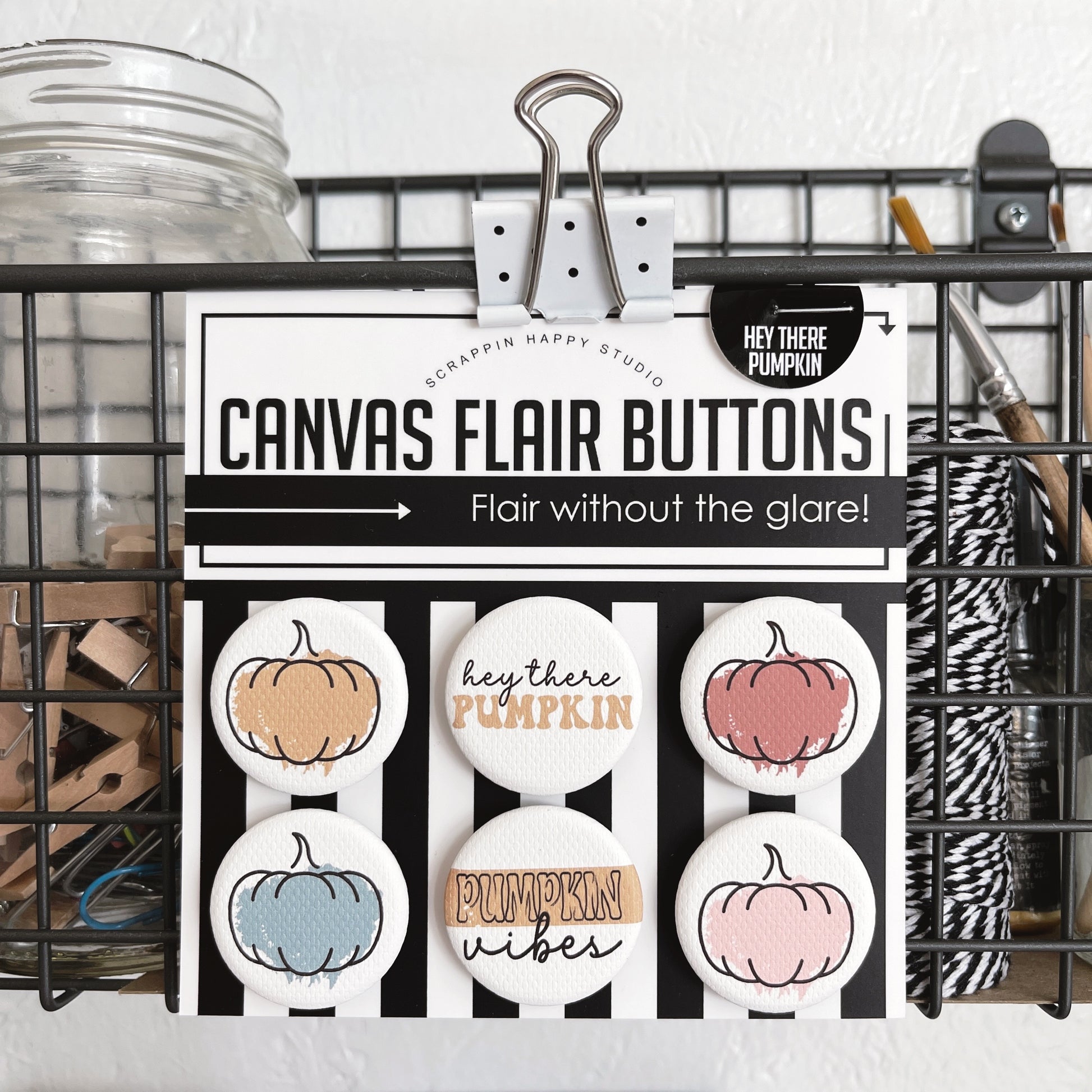 Set of (6) 1.25" canvas flair, comes attached to a backing card.