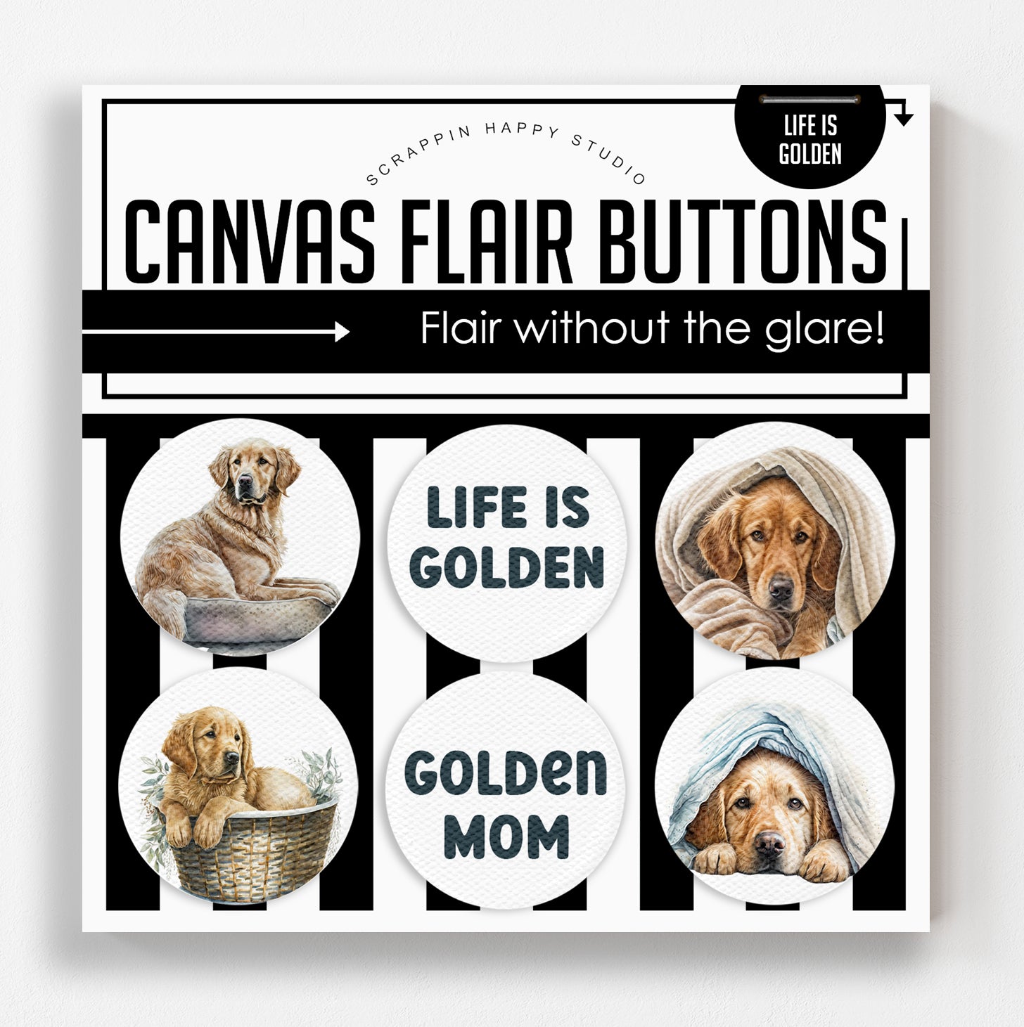 Set of (6) 1.25" canvas flair, comes attached to a backing card.