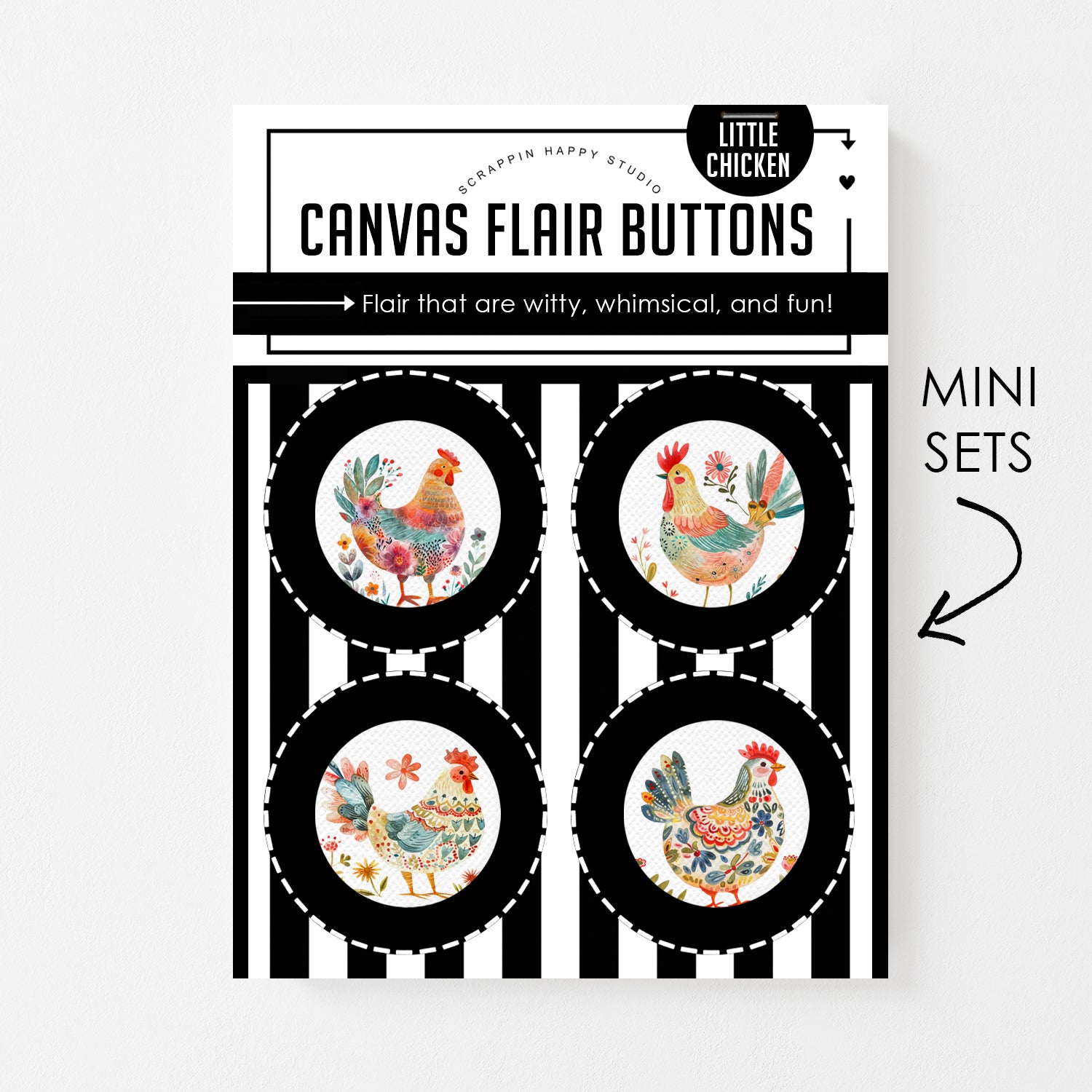 Set of (4) 1" canvas flair, comes attached to a backing card.