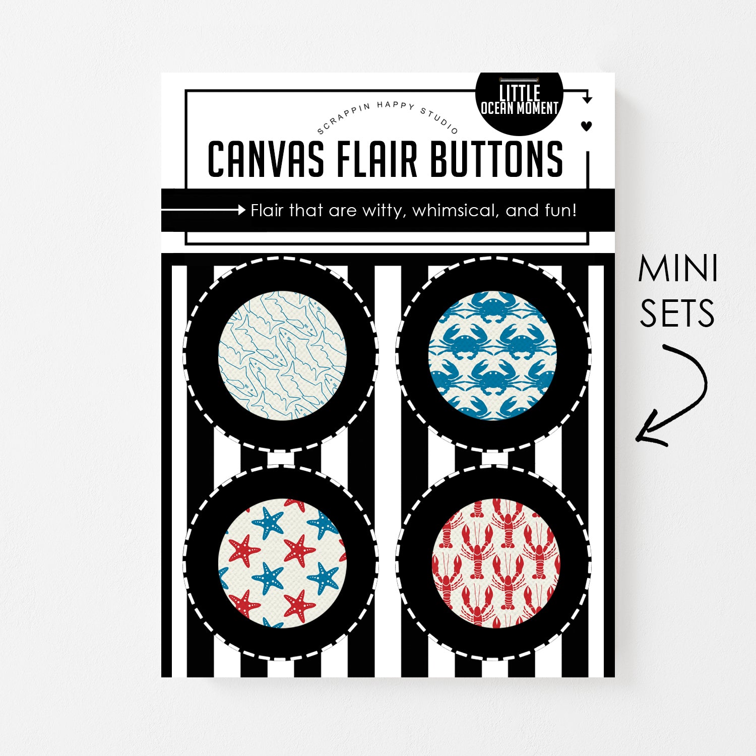 Set of (4) 1" canvas flair, comes attached to a backing card.