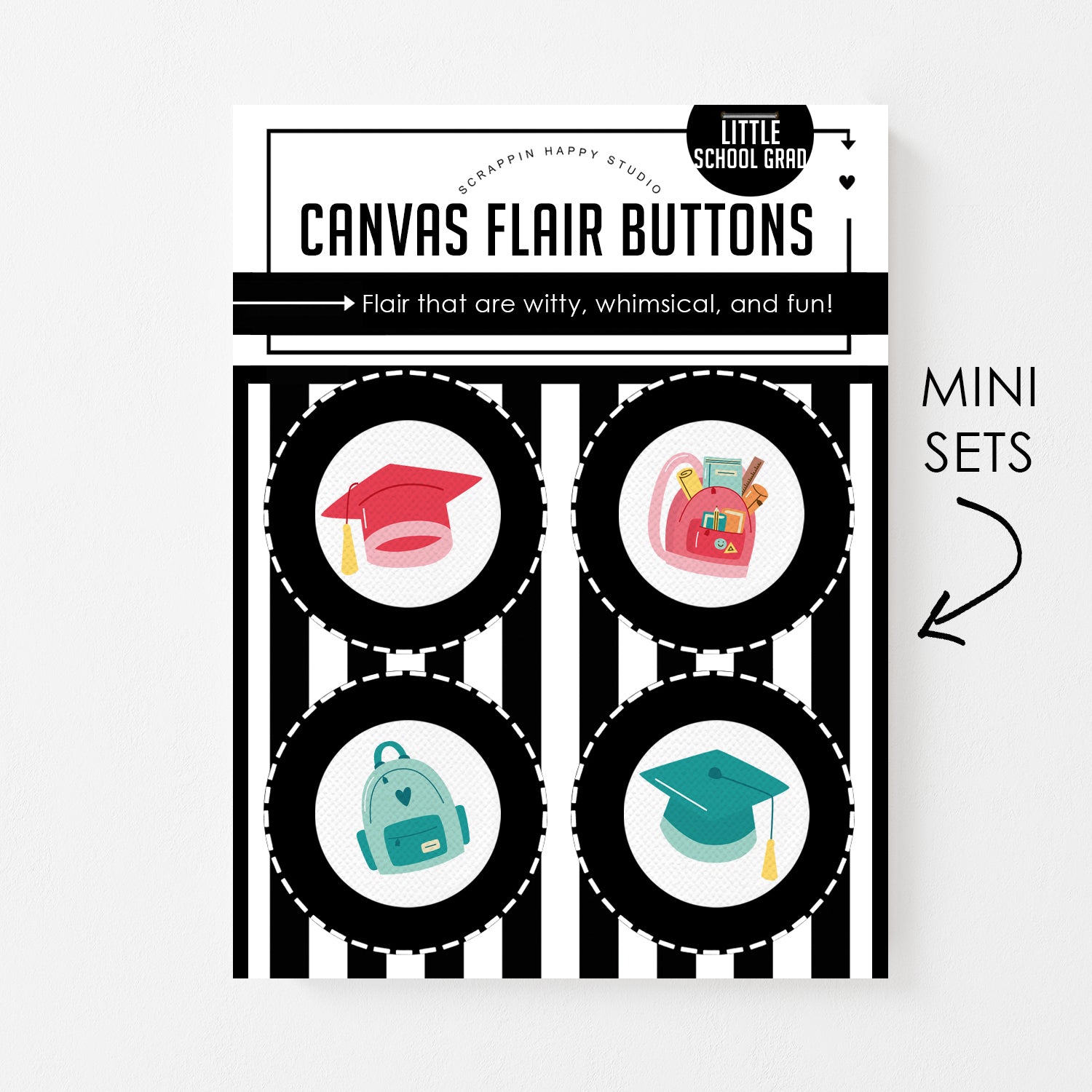 Set of (4) 1" canvas flair, comes attached to a backing card.