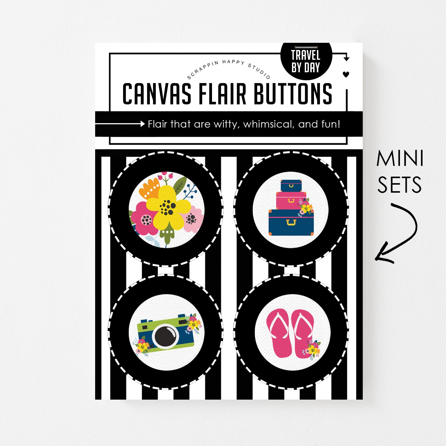 Set of (4) 1" canvas flair, comes attached to a backing card.