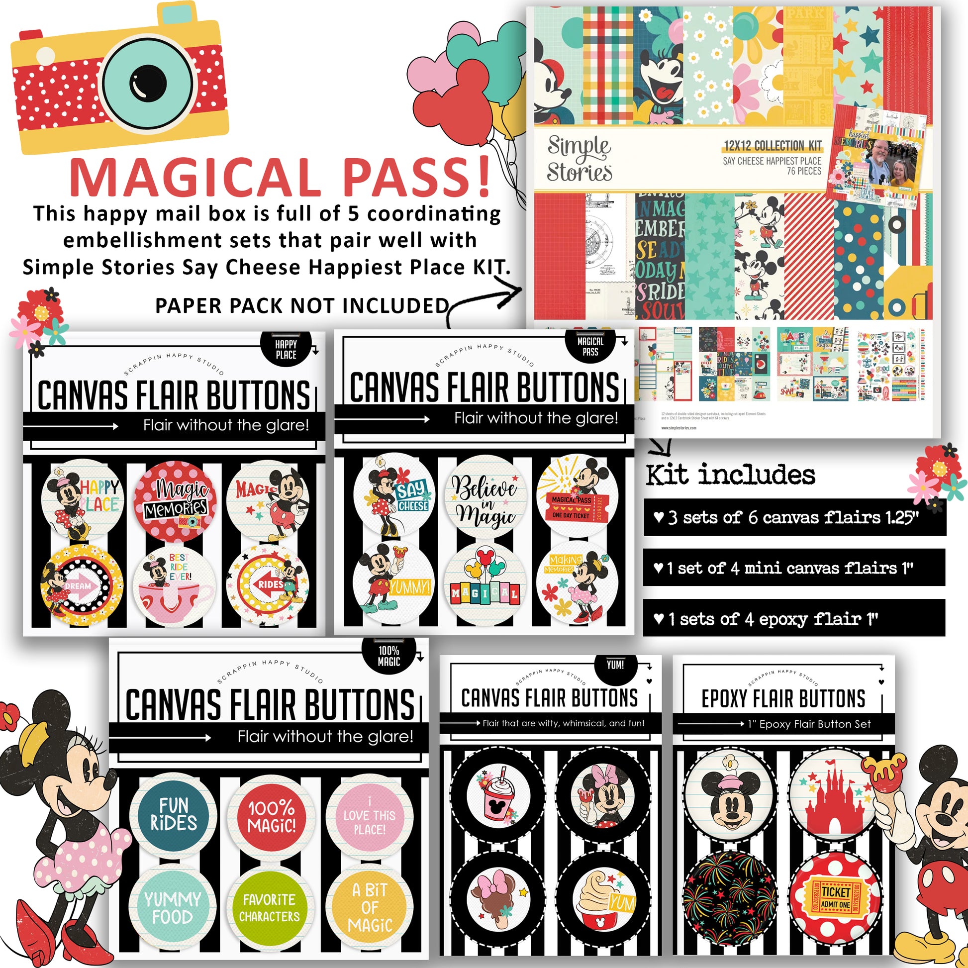 This happy mail box is full of 5 coordinating embellishment sets that pair well with Simple Stories Say Cheese Happiest Place Kit.