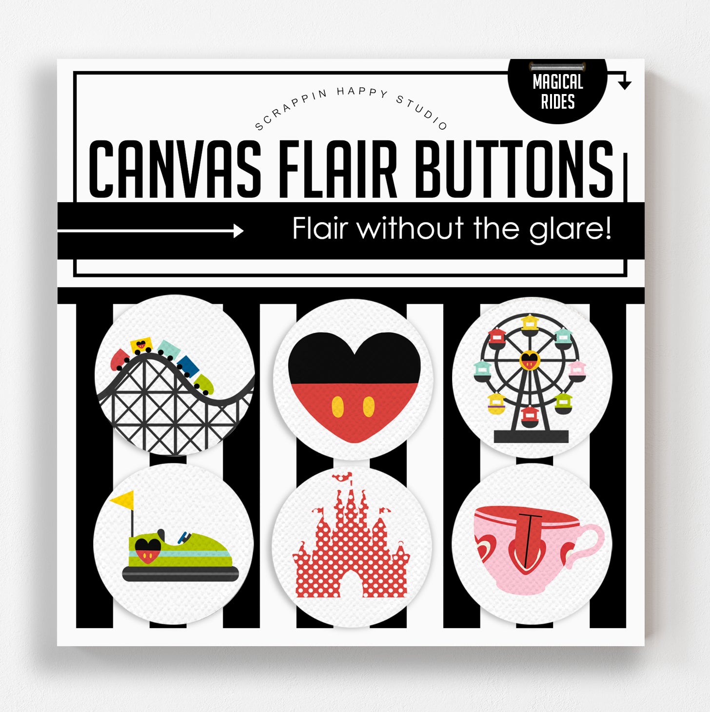 Set of (6) 1.25" canvas flair, comes attached to a backing card.