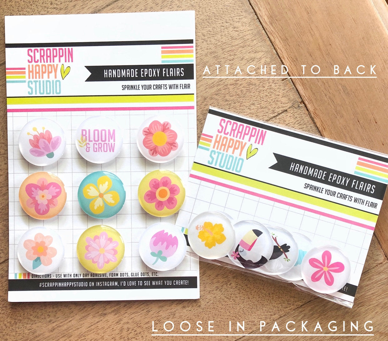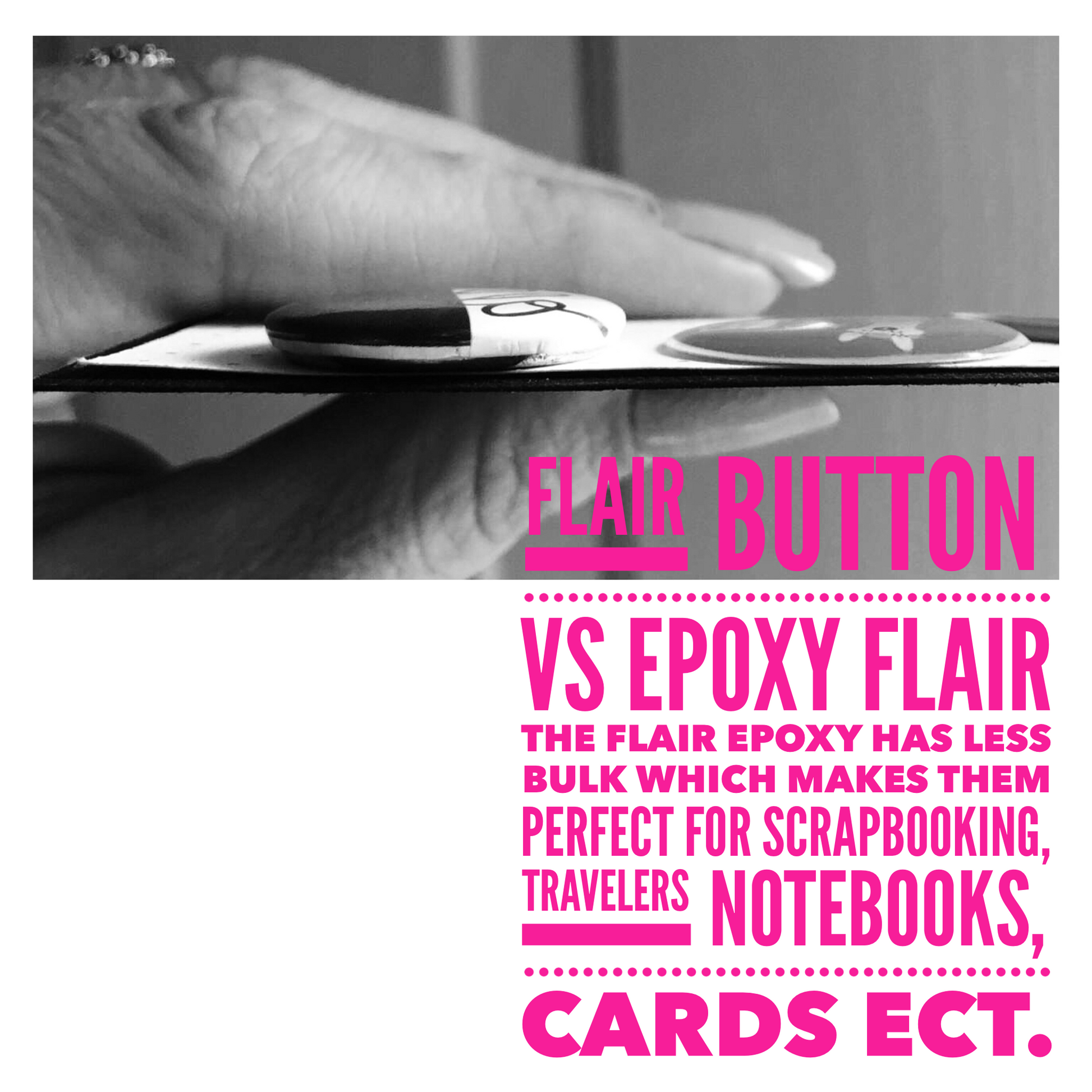 What are epoxy flairs? Traditional Flair Buttons are made from metal and add more bulk. Our flairs are created with epoxy, a more soft and flexible material, that creates a fun 3D look without adding bulk. You can adhere them flat or add a foam dot for added dimension. These epoxy flairs are a perfect addition to scrapbook pages, cards, project life and so much more!