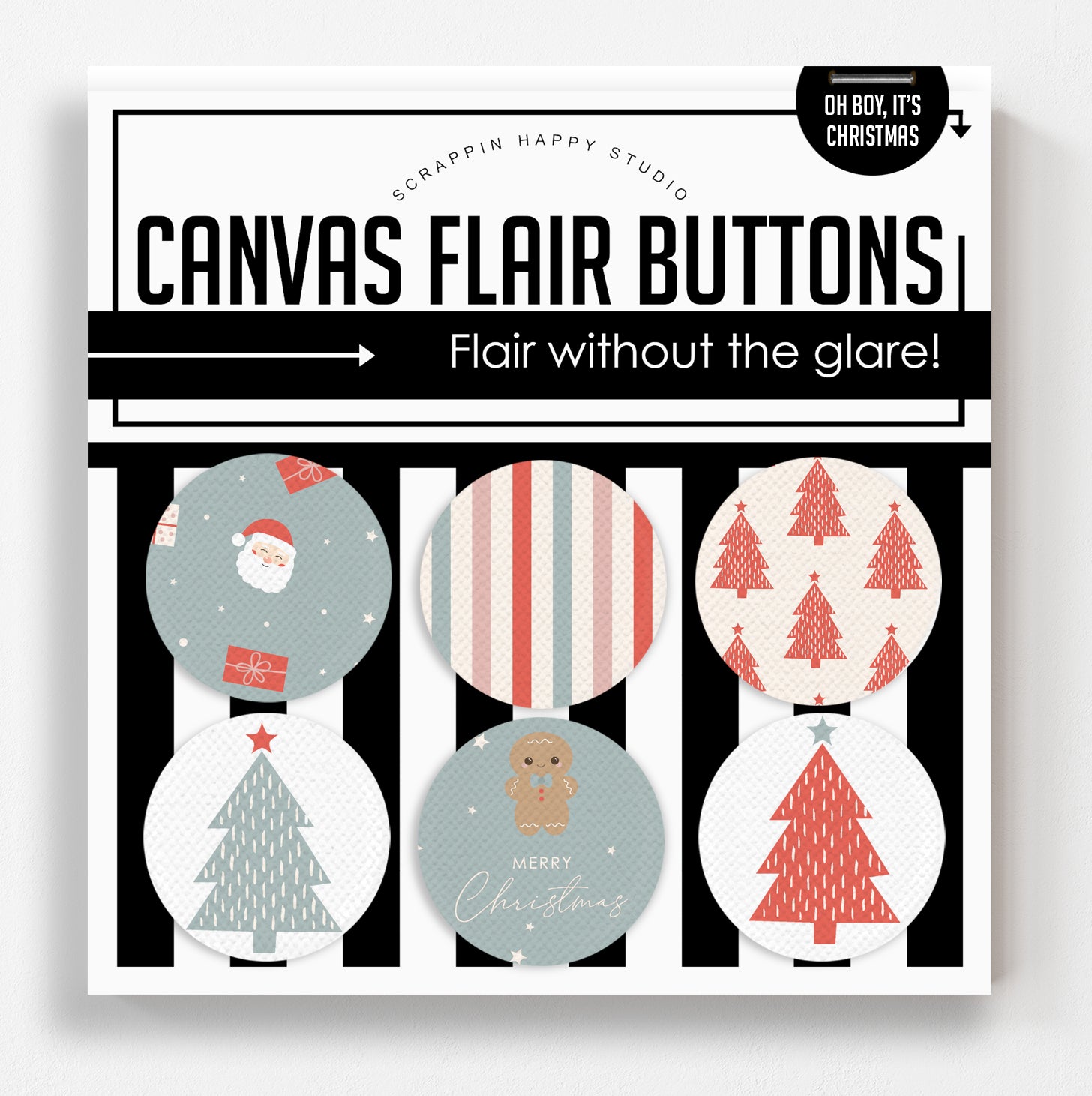 Set of (6) 1.25" canvas flair, comes attached to a backing card.