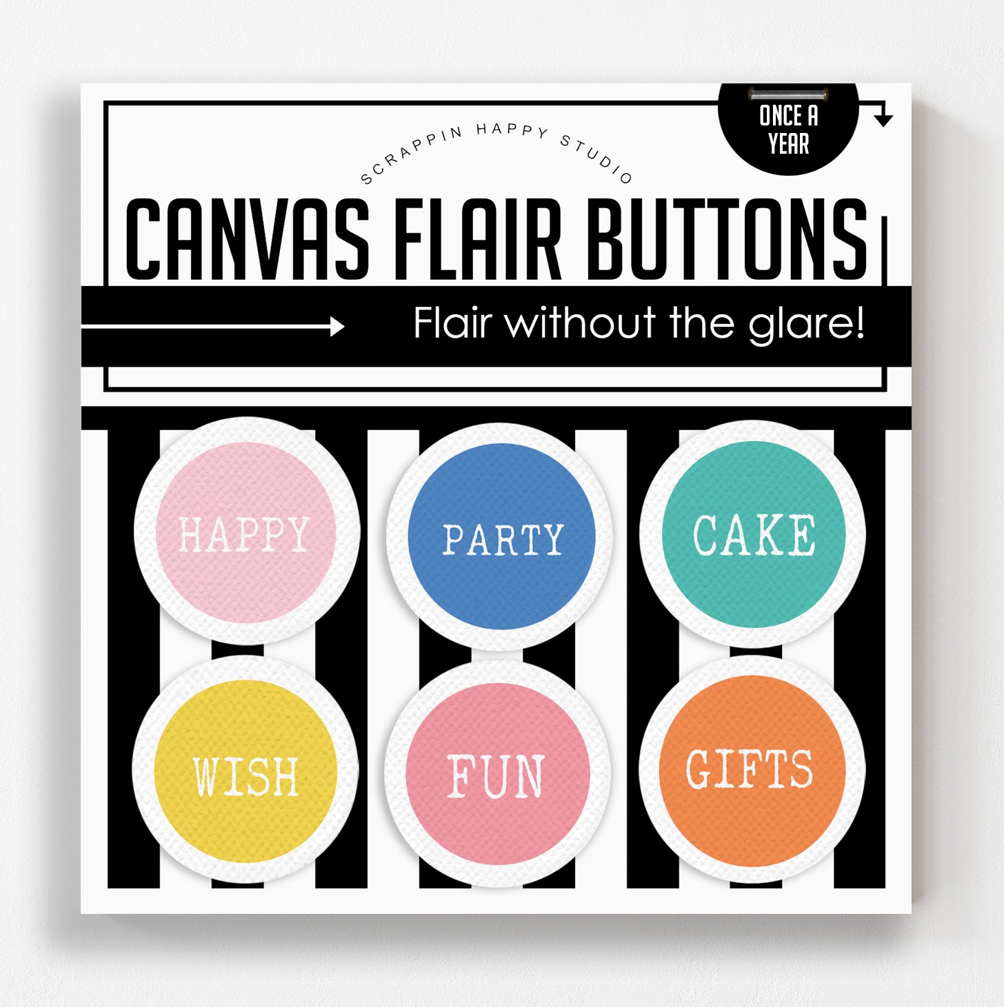 Set of (6) 1.25" canvas flair, comes attached to a backing card.