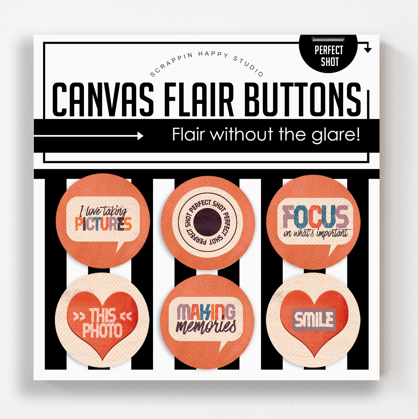 Set of (6) 1.25" canvas flair, comes attached to a backing card.