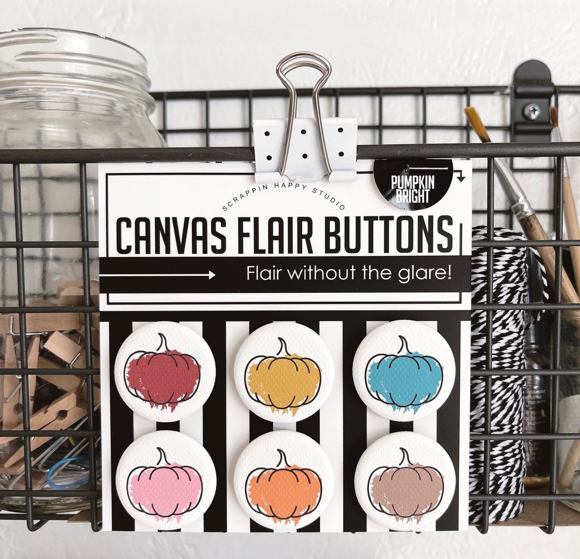 Set of (6) 1.25" canvas flair, comes attached to a backing card.