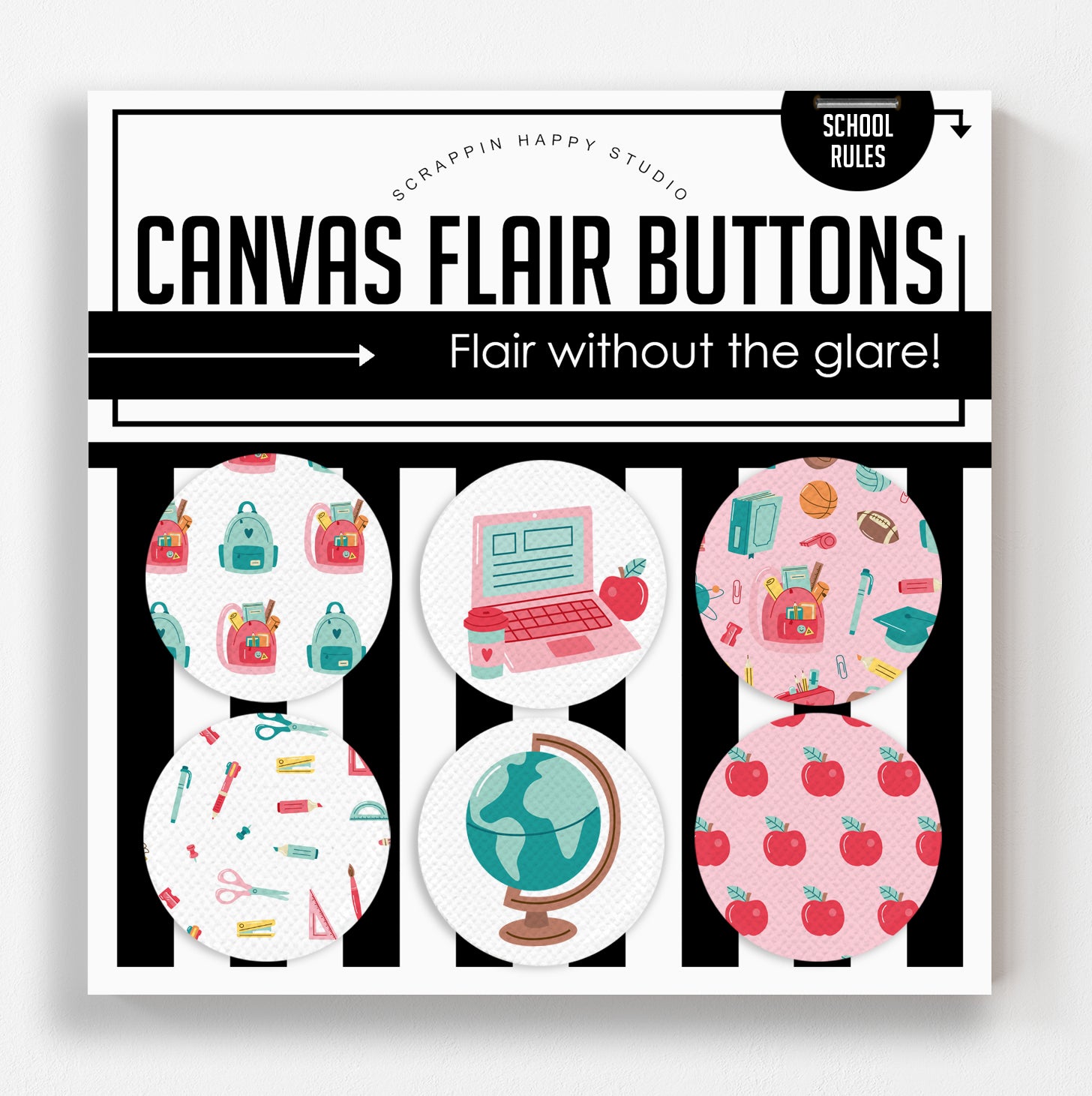 Set of (6) 1.25" canvas flair, comes attached to a backing card.