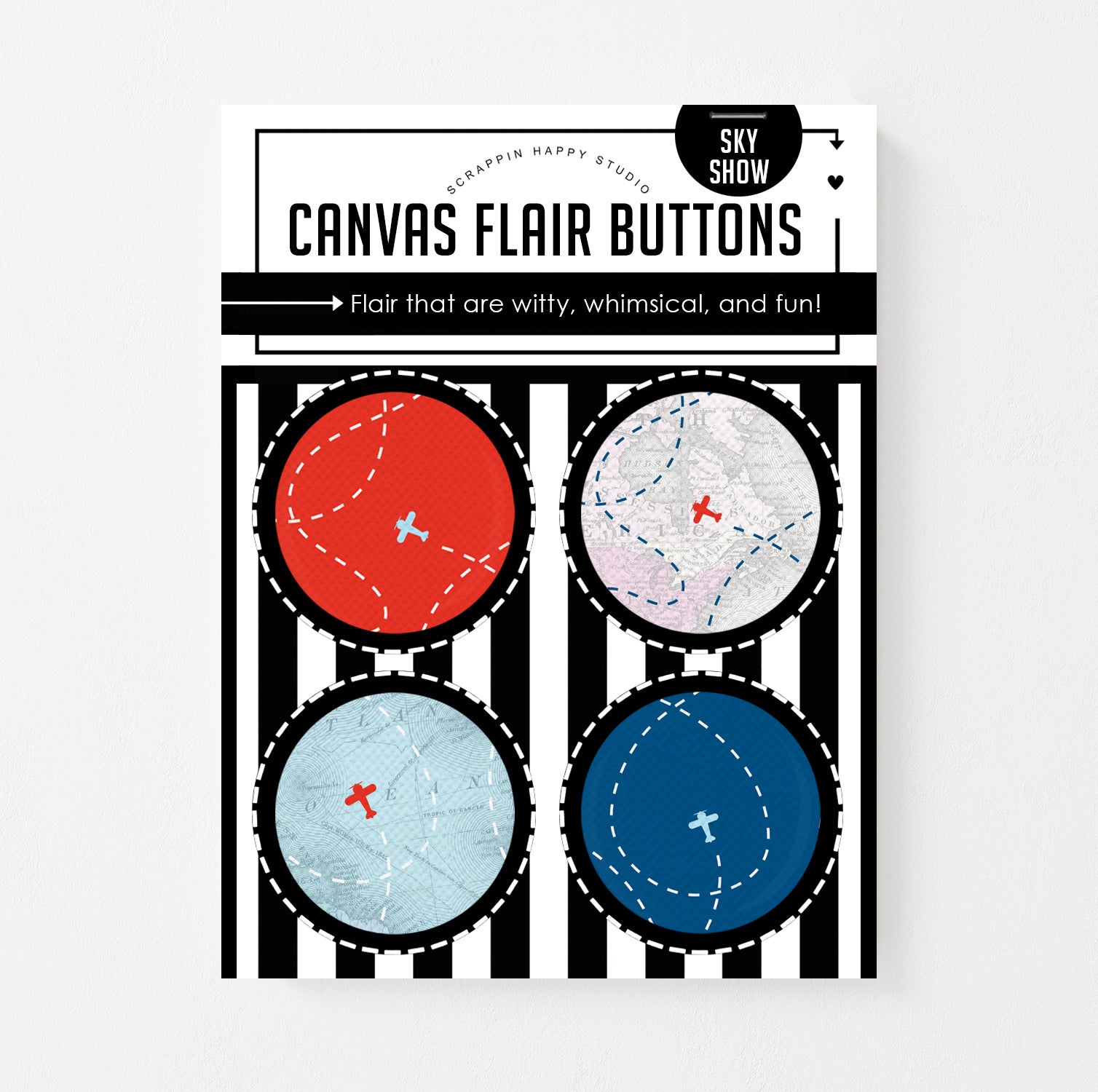 Set of (4) 1.25" canvas flair, comes attached to a backing card.