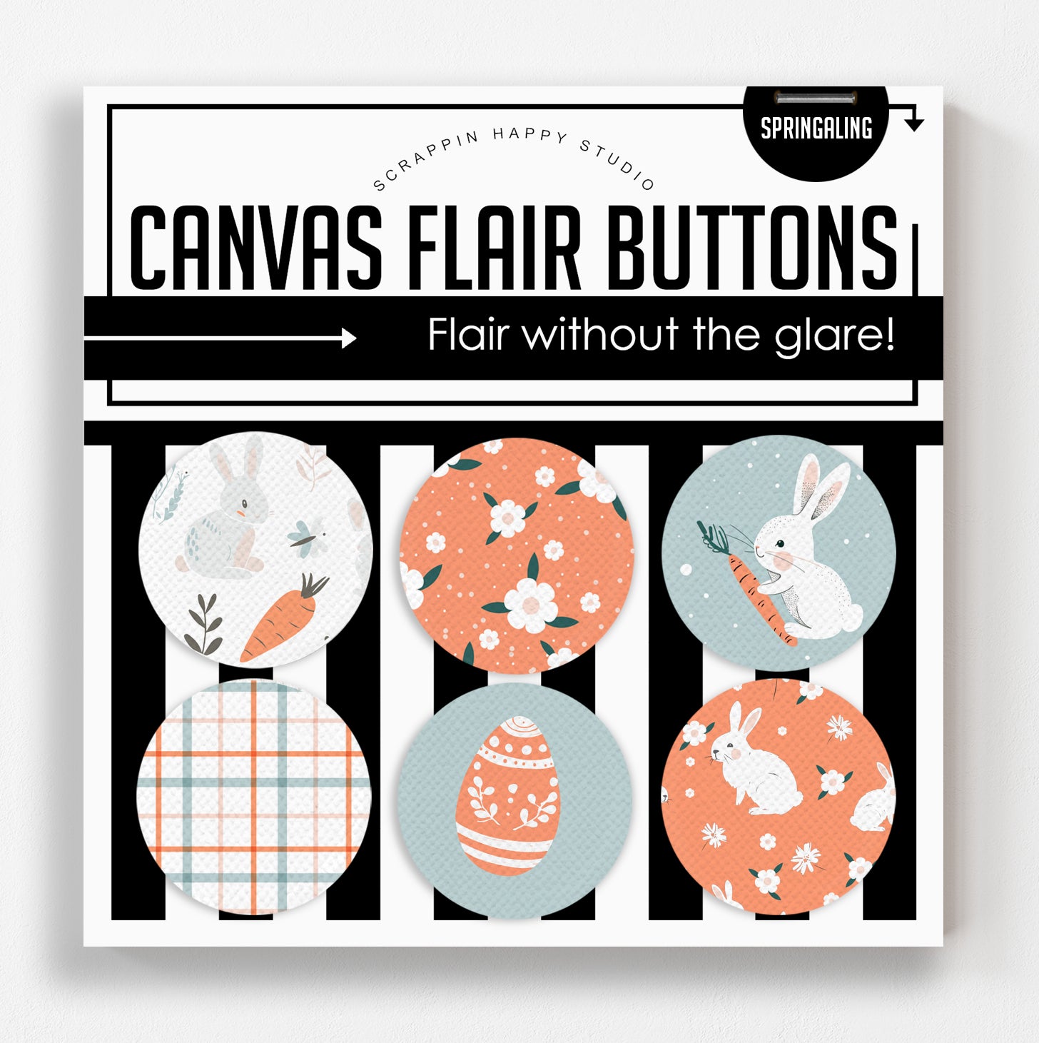 Set of (6) 1.25" canvas flair, comes attached to a backing card.