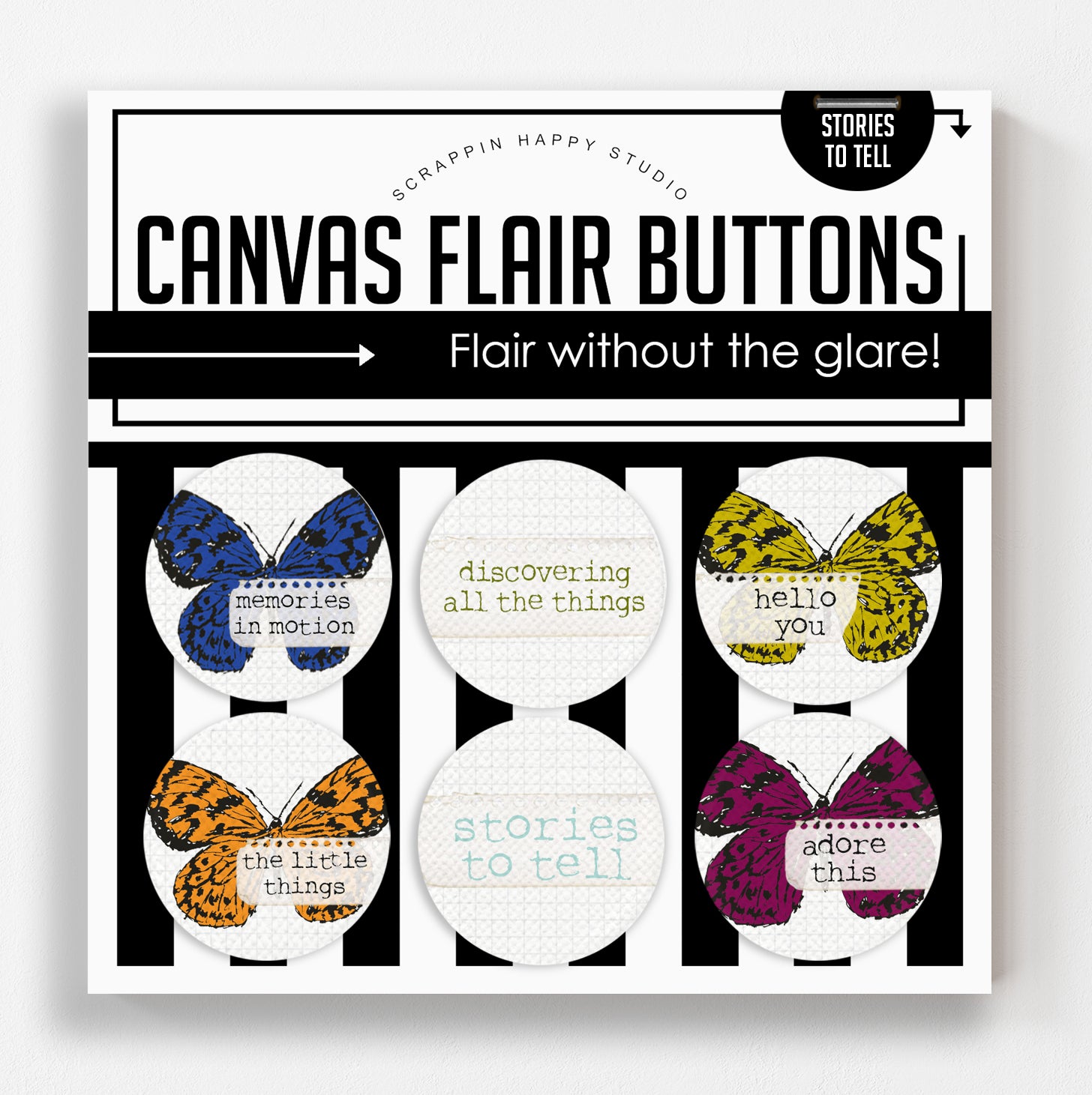 Set of (6) 1.25" canvas flair, comes attached to a backing card.