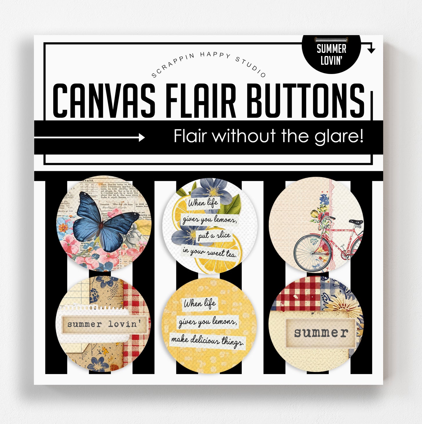 Set of (6) 1.25" canvas flair, comes attached to a backing card.