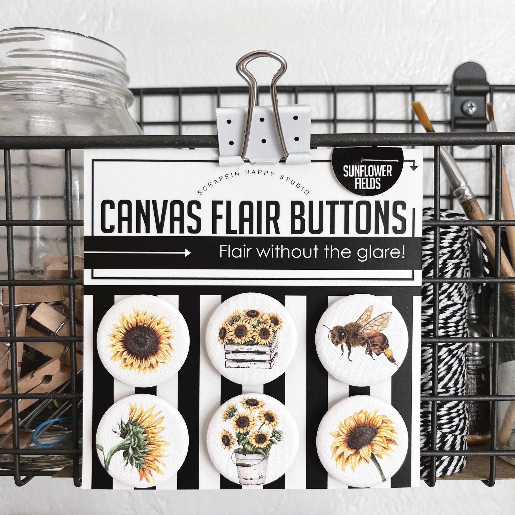 Set of (6) 1.25" canvas flair, comes attached to a backing card.