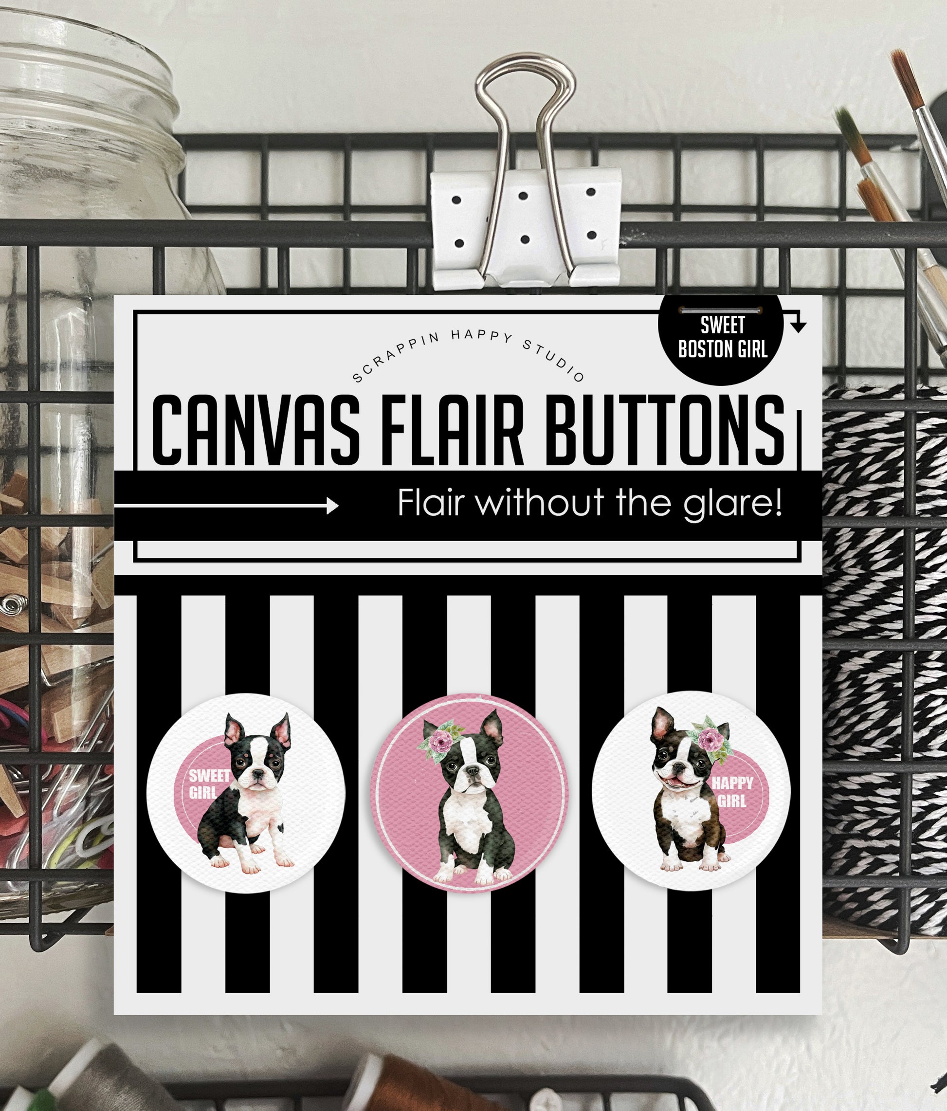 Set of (3) 1.25" canvas flair, comes attached to a backing card.