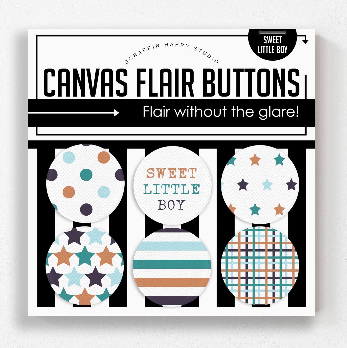 Set of (6) 1.25" canvas flair, comes attached to a backing card.