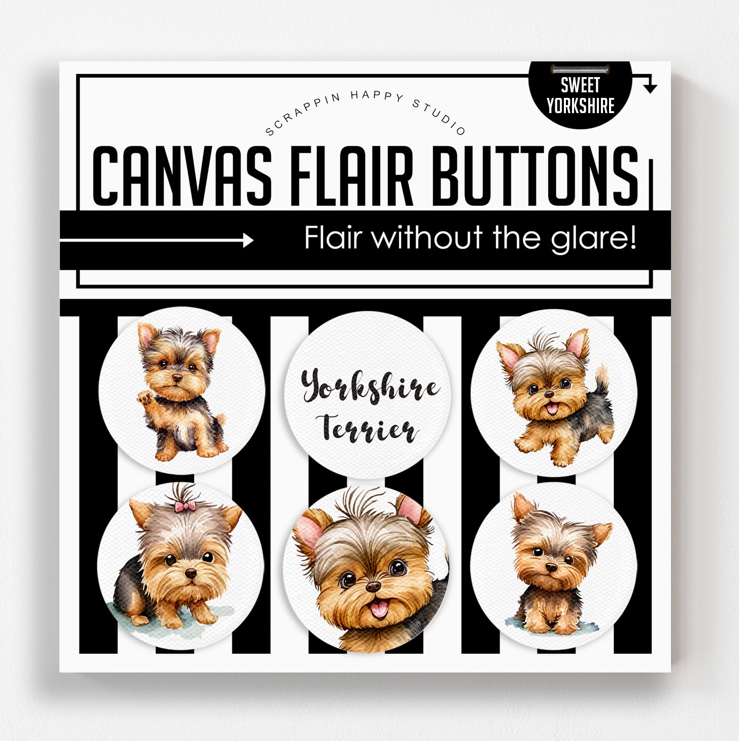 Set of (6) 1.25" canvas flair, comes attached to a backing card.