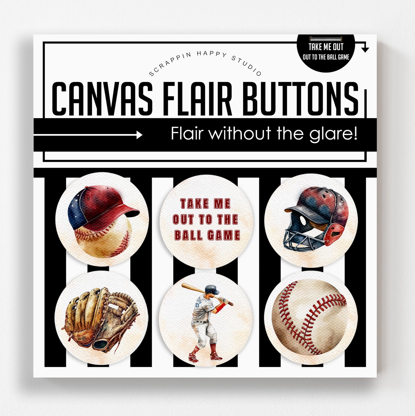 Set of (6) 1.25" canvas flair, comes attached to a backing card.