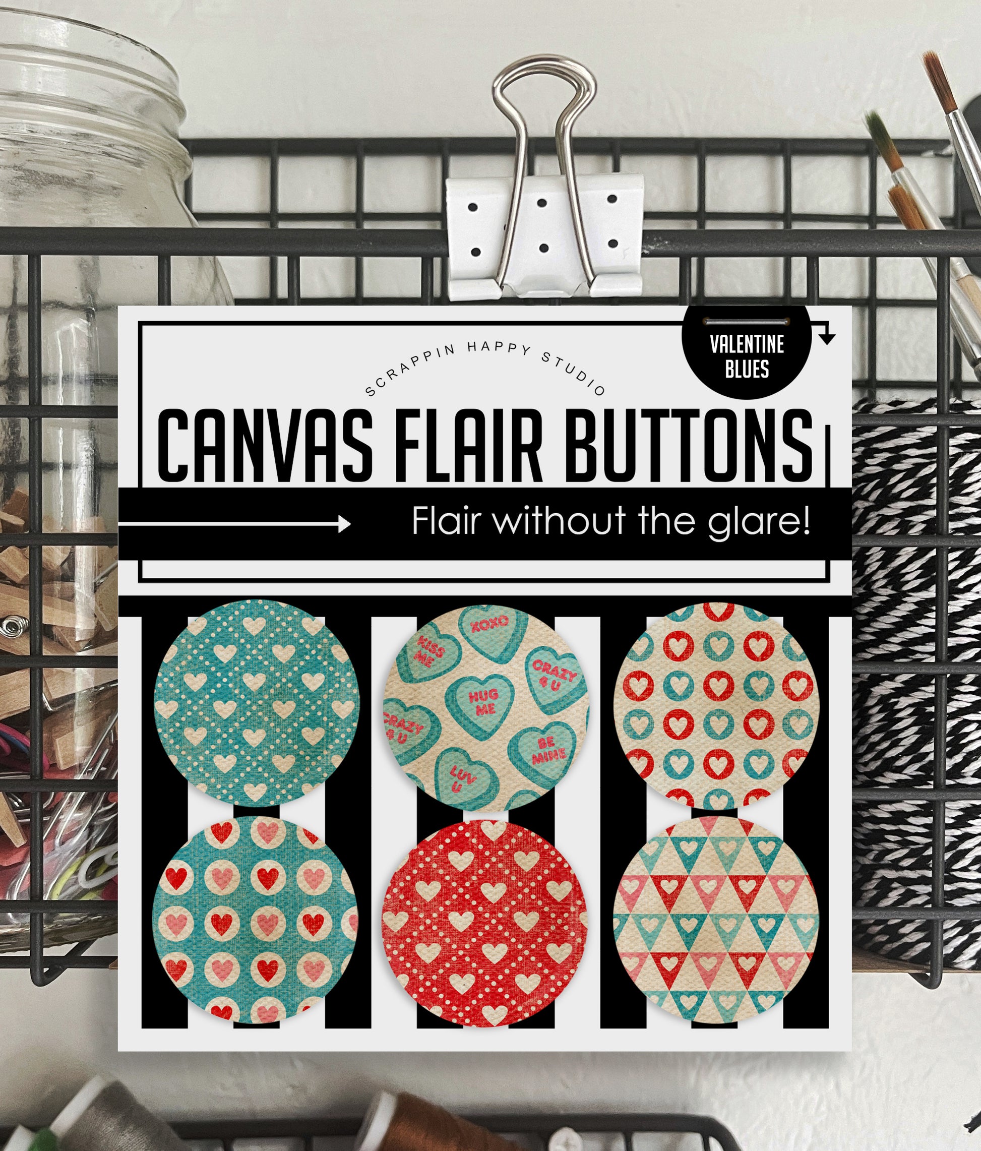 Set of (6) 1.25" canvas flair, comes attached to a backing card.